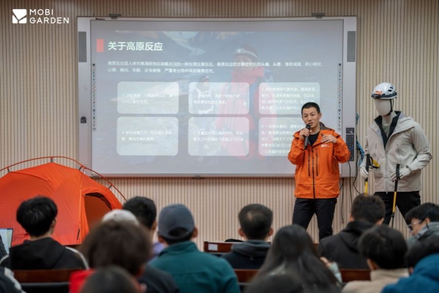 活动还特邀户外徒步达人石头(周扬),以户外安全教育、徒步经验与路线分享为主题展开主题交流与分享。石头以其丰富的横断山脉与国内其他线路徒步经历现身说法,分享高海拔徒步风险识别与应对,包括如何应对“失温”、搭建庇护所等实战话题,为参与者提供了宝贵的安全指南和装备建议。分享结束后石头还与同学们面对面交流,现场气氛热烈,笑声不断,原定1小时的活动,持续了近1小时40分钟,同学们仍意犹未尽,活动取得圆满成功。