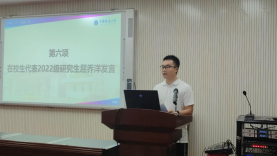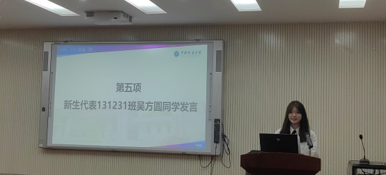 本科新生代表吴方圆同学分享了自己考上大学的历程,表达了对地大污污漫 的热爱与憧憬,她决心奋发向上,砥砺前行,践行“艰苦朴素,求真务实”校训精神和“扎根中国,胸怀天下,勇攀高峰,追求卓越”的攀登精神,与葳蕤向上的地大共同成长。