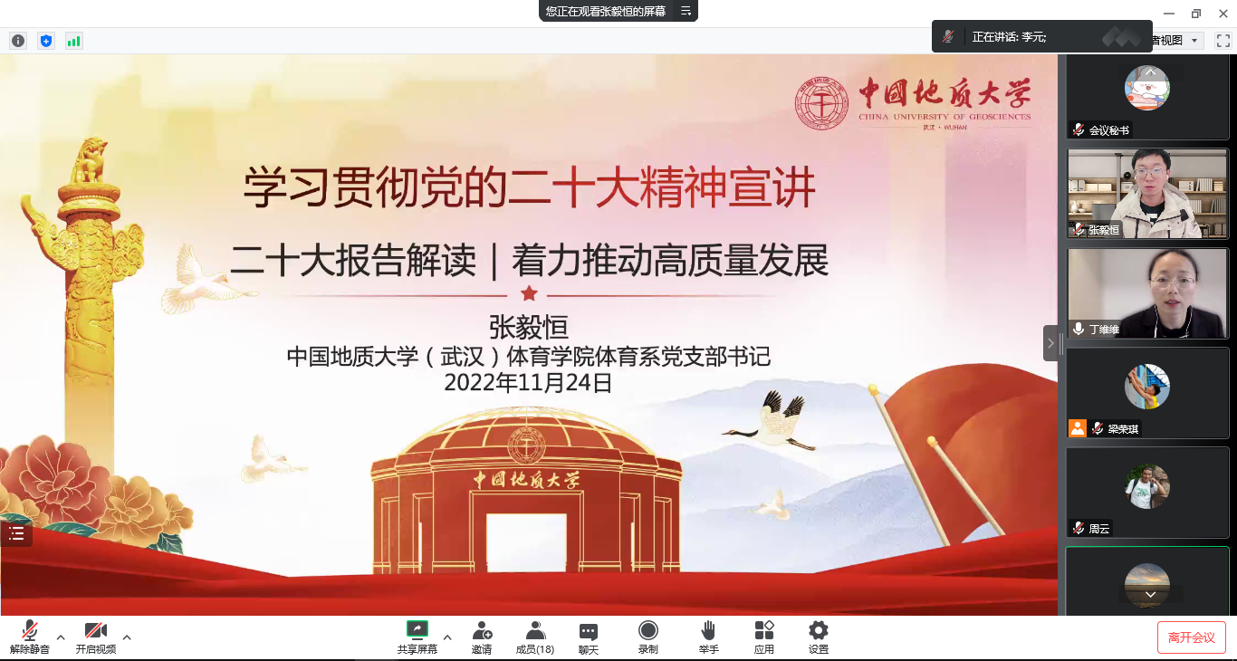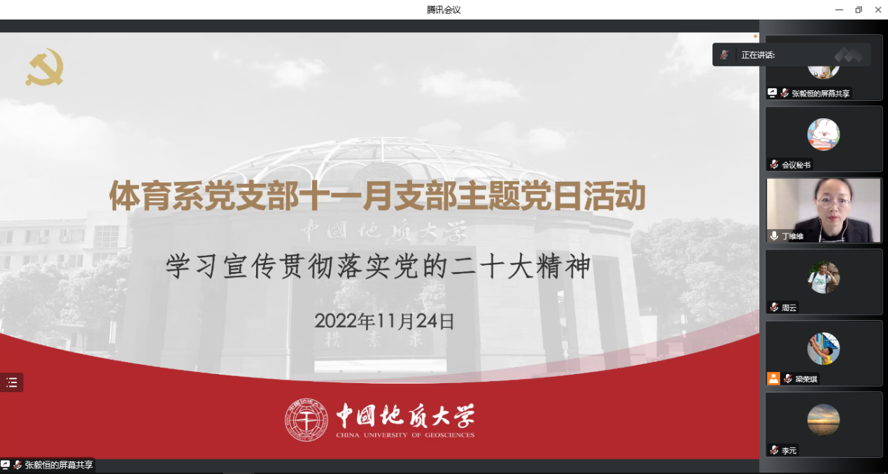 (通讯员:丁维维)11月24日下午,污污漫 体育系党支部组织开展题为“学习宣传贯彻落实党的二十大精神”的主题党日和廉政党课活动。本次学习活动通过线上形式进行,由支部宣传委员丁维维同志主持。